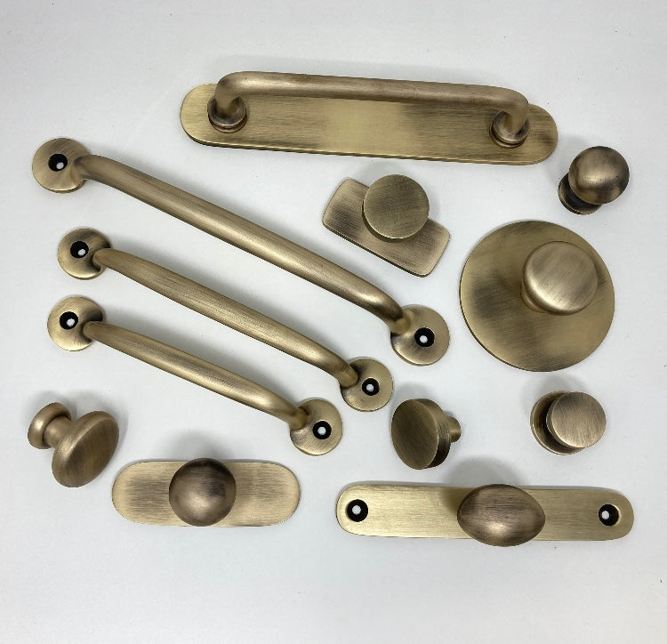 Stunning luxury collection of antiqued solid brass knobs, handles and backplates. Beautiful hardware that is heavy and tactile and will transform your cabinets and doors. All of our cabinetry comes with necessary fixings